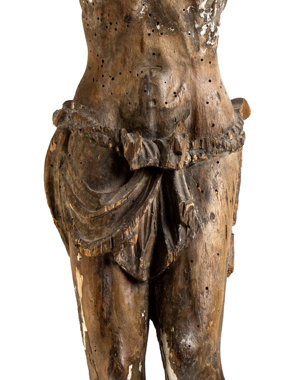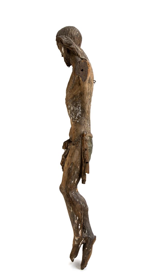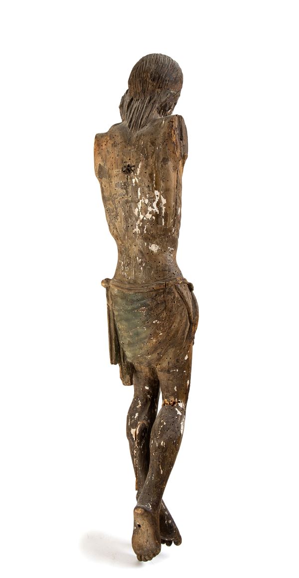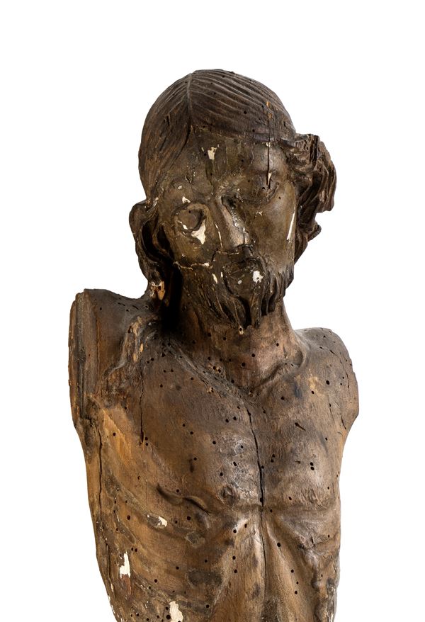 The sculpture appears mutilated, missing both arms and the cross; It shows losses in the painted surface, but still retains clear traces of the original polychromy. The body of Christ, naked except for the loincloth knotted at the side, is carved with a twist that emphasizes both physical and spiritual suffering: the head leans toward the right shoulder, the eyes are closed, and the facial features are sunken. The musculature is carefully rendered, with visible ribs and abdominal muscles.