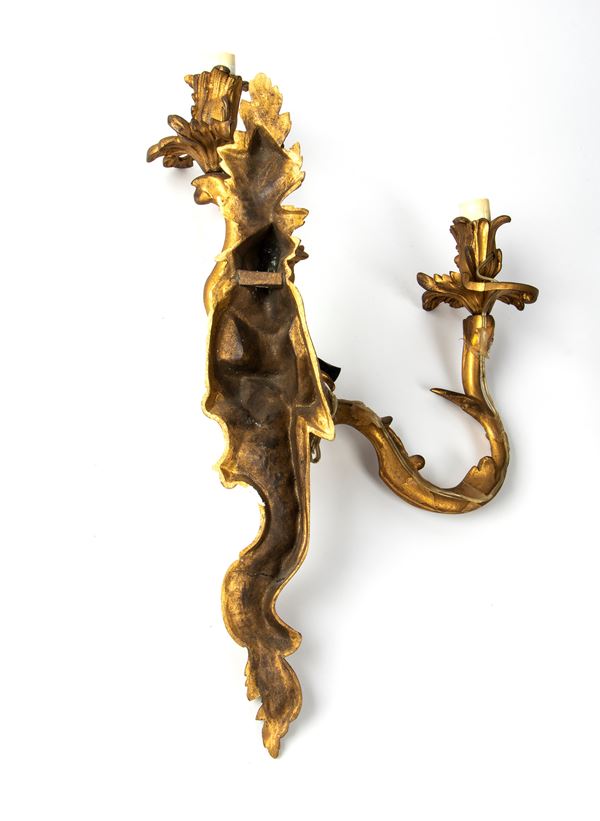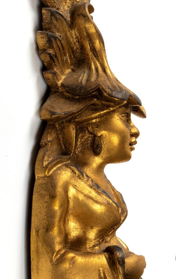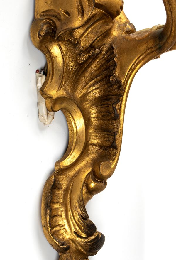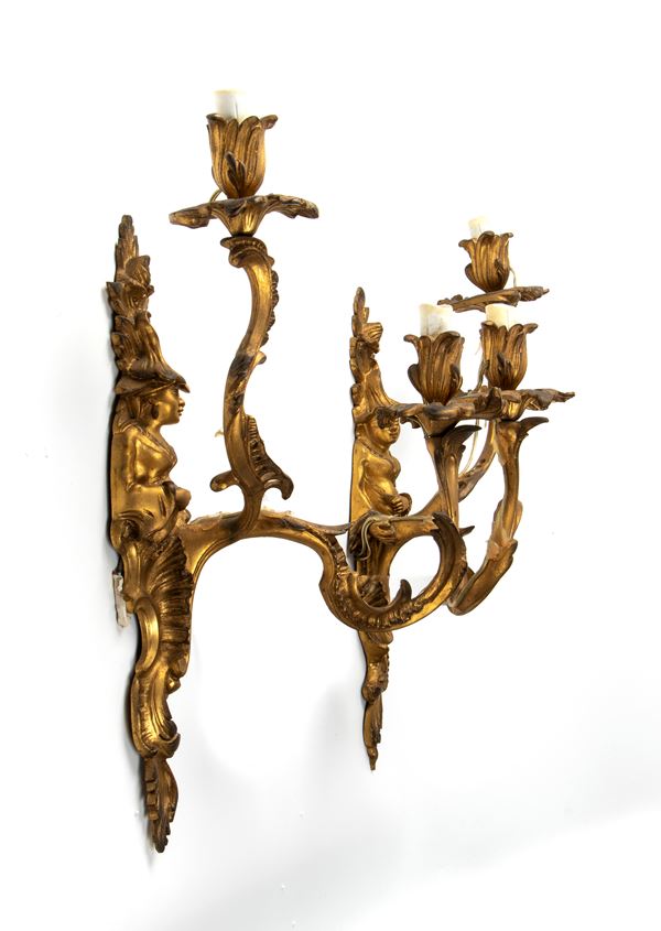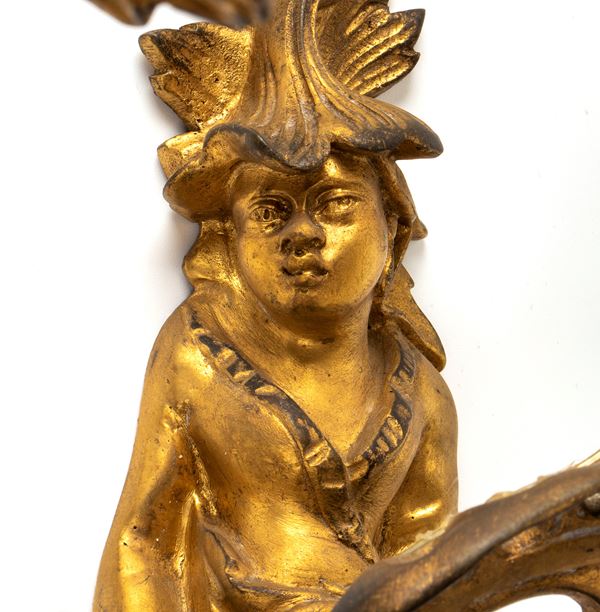 two-light gilt bronze wall sconces with finely chiseled oriental figures. Volute arms with plant and floral motifs.
