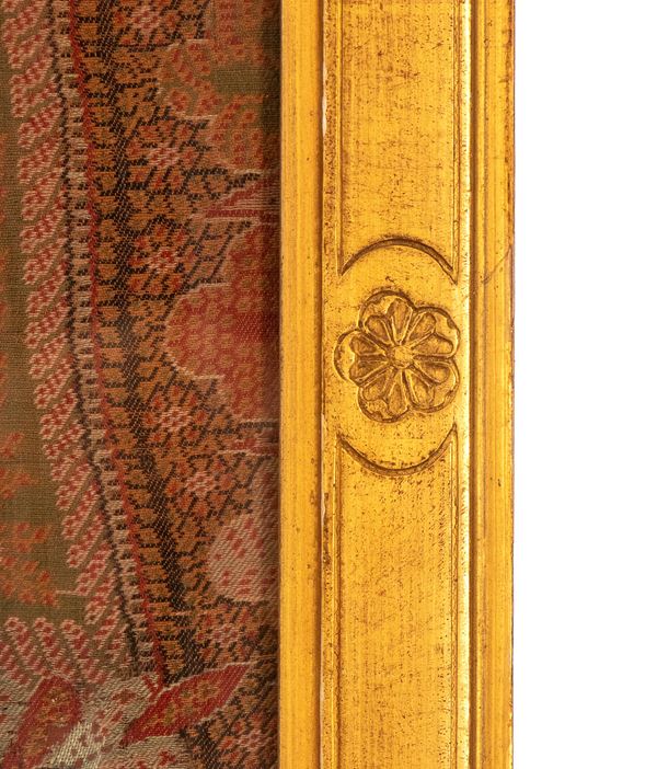 Of rectangular shape decorated with arabesques and peacock tails. Within gilt frame.