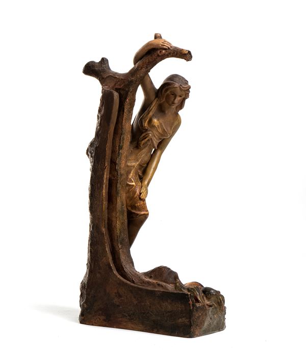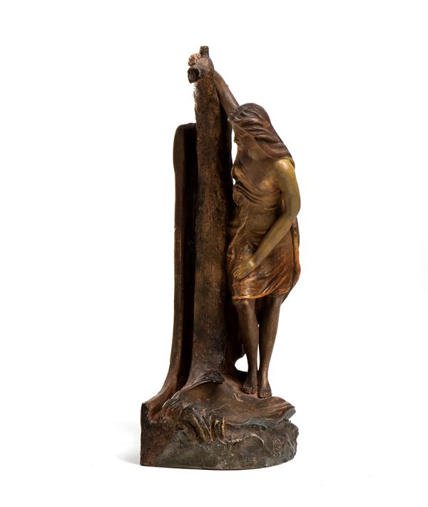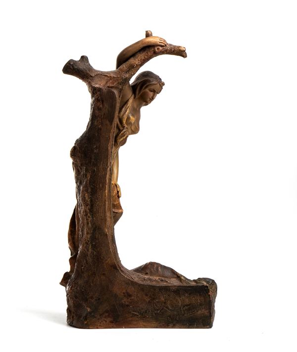 depicting a female figure wrapped in a thin cloth, leaning against a log.