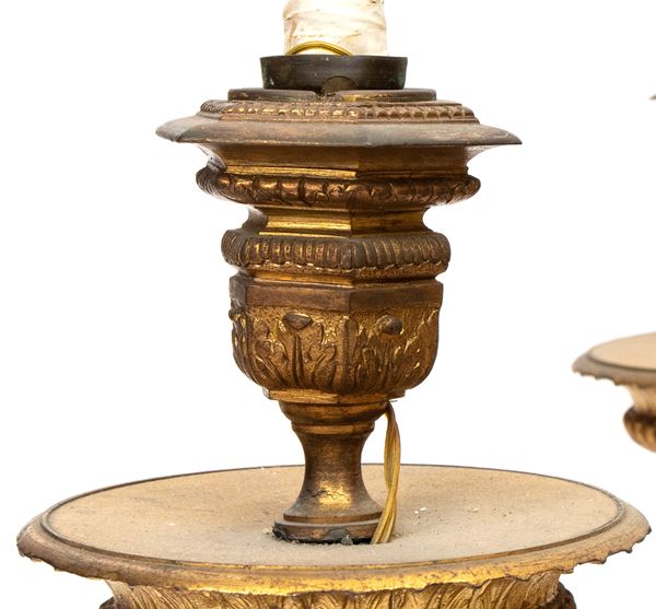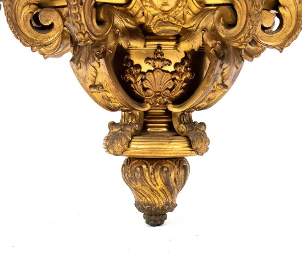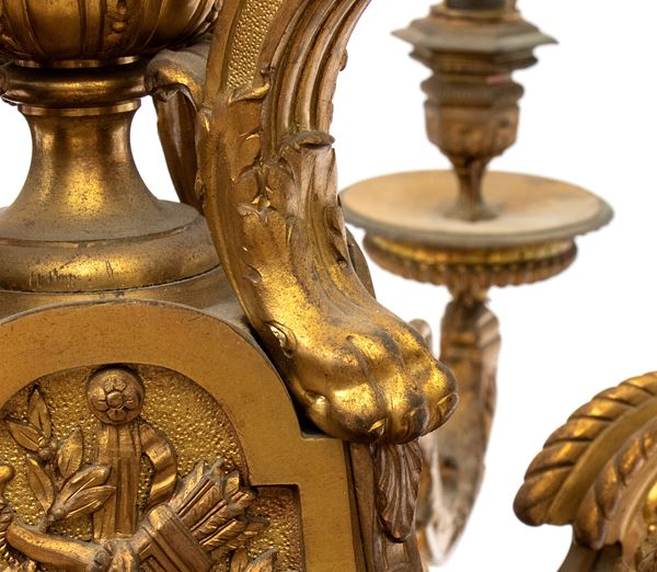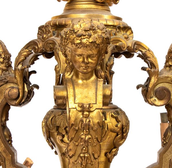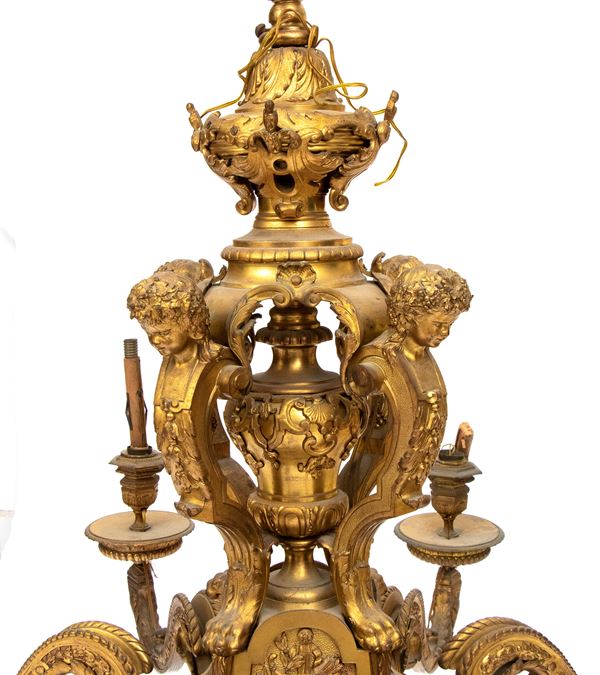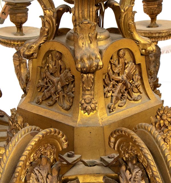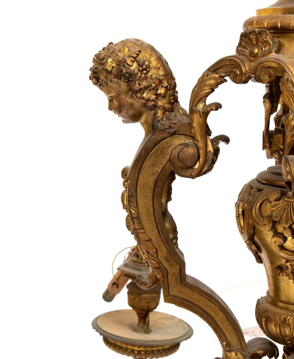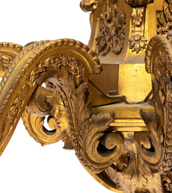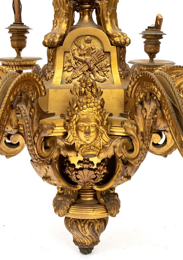 Impressive eight-light chandelier made of gilded bronze, casting and chiseling of great quality. Formed by stems with floral motifs that are connected with female figures, masks and mythological figures