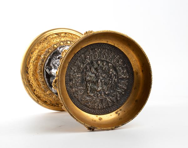The Bacchanal was a religious festival in ancient Rome dedicated to Bacchus, or Pan, the god of wine, intoxication, and the liberation of the senses. During these celebrations, participants indulged in wild rituals, characterized by dance and music, celebrating ecstasy and the divine, with abundant wine consumption and freedom of attire. This reference is also evident in the decorations of the upper part, made of gilded bronze, where hanging grape clusters are depicted, and in the upper section, where the motifs of the dancing putti are repeated. At the center of this, there is a scene showing nude male and female figures, lying supine, with a central figure possessing goat horns playing the flute, known as the "Pan flute." In fact, the figure playing the instrument can be identified as Pan.