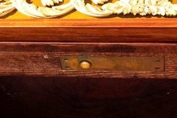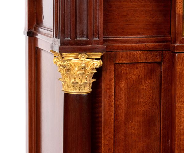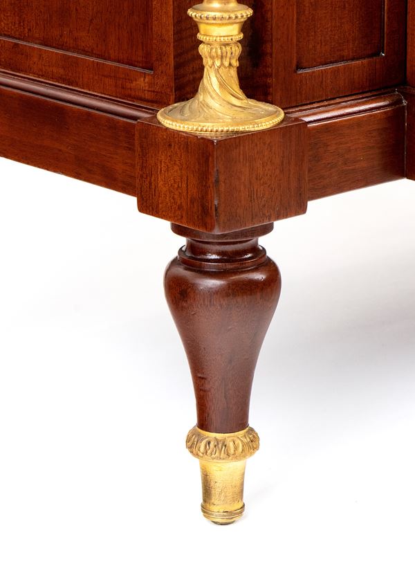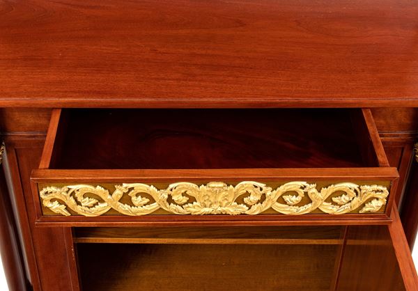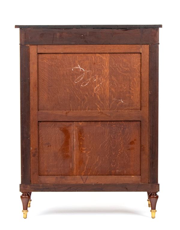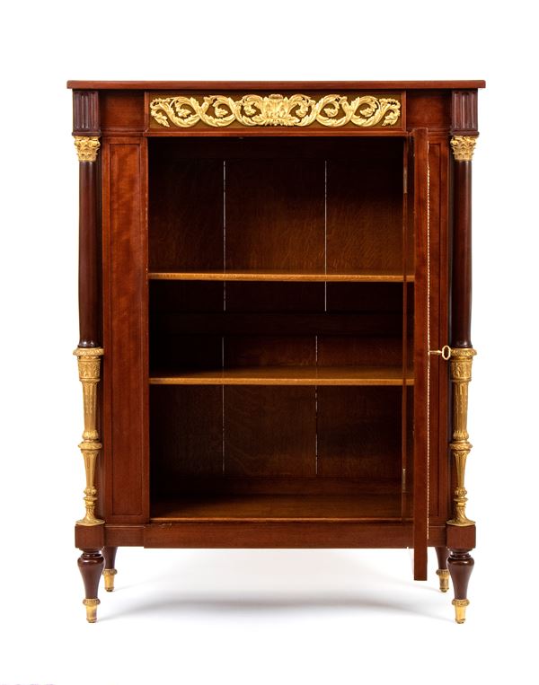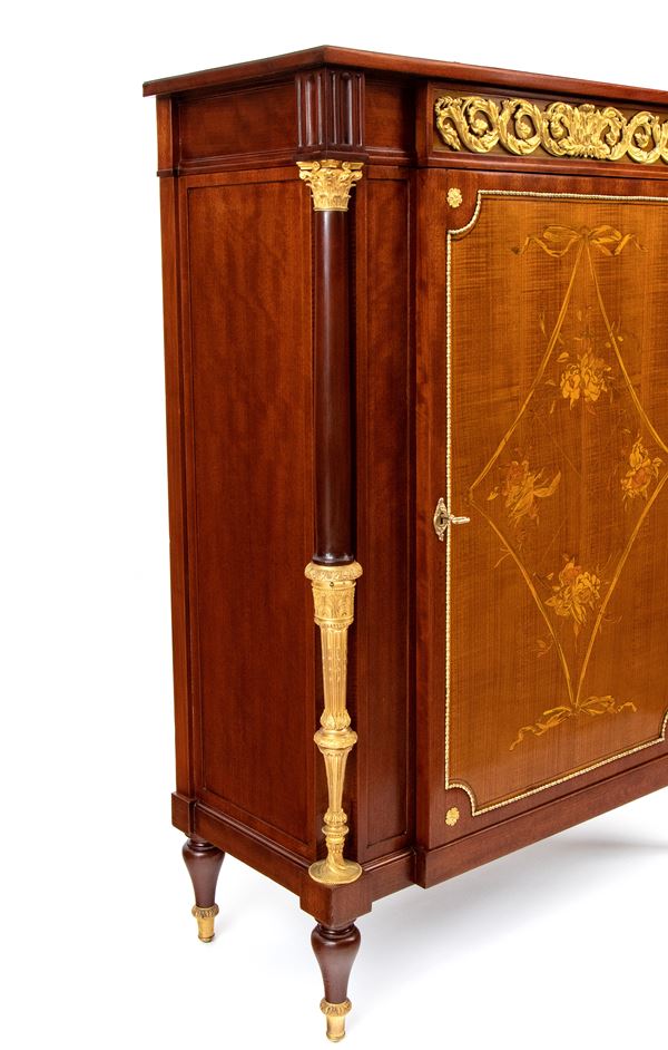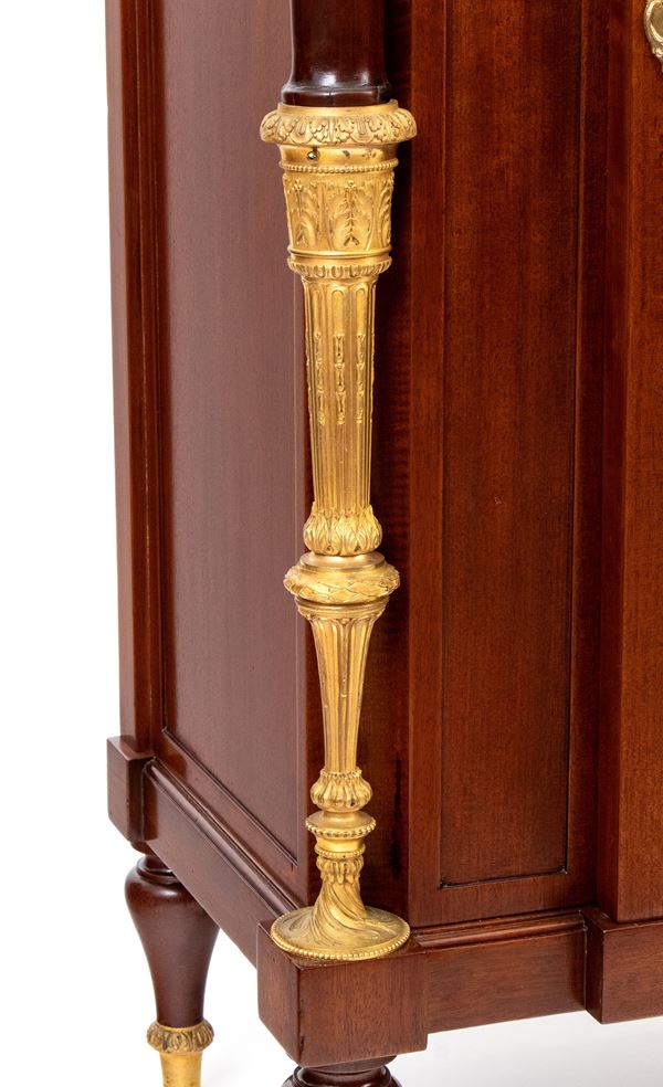 Made entirely of mahogany, embellished in the central panel with rhombus-shaped floral inlays. Front with two plain columns with gilded bronze base and capital and central door with gilded bronze applications. In the upper part a concealed drawer with opening button inside the door.