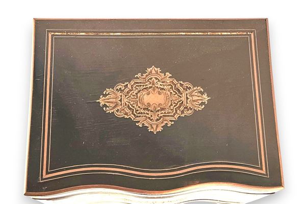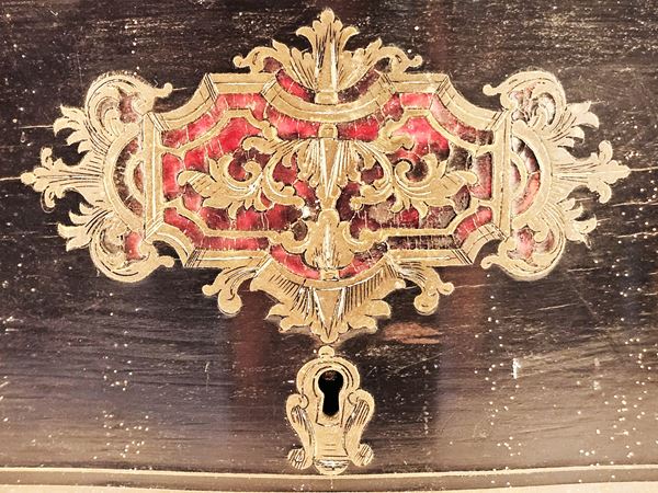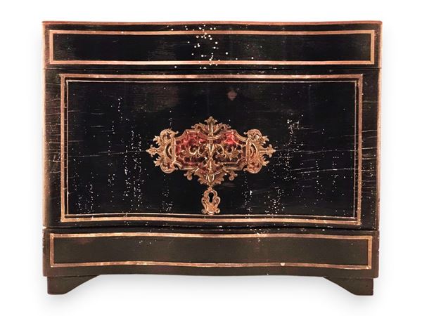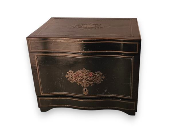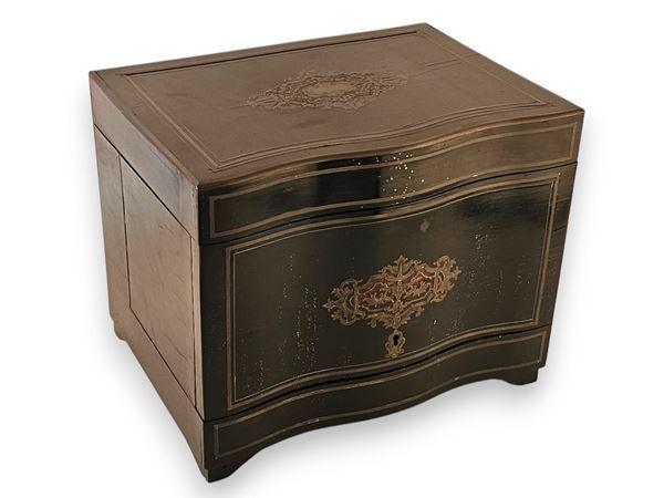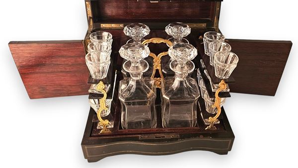 in ebonised wood with a shaped front, inlaid with brass and tortoiseshell (hawksbill sea turtle, Eretmochelys imbricata, Cheloniidae) with Boulle-style phytoform motifs on the lid and front. On the inside are four bottles and twelve cut-glass glasses.