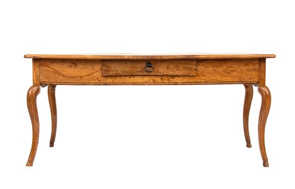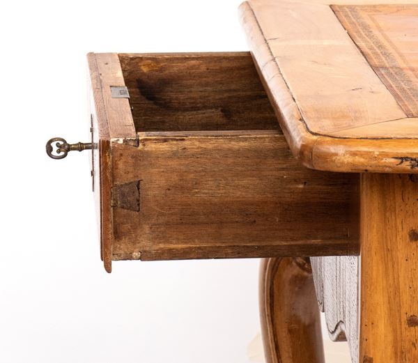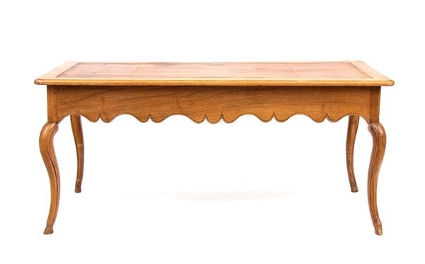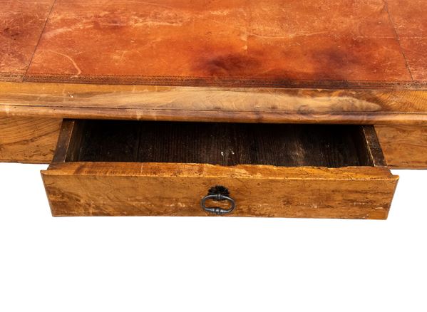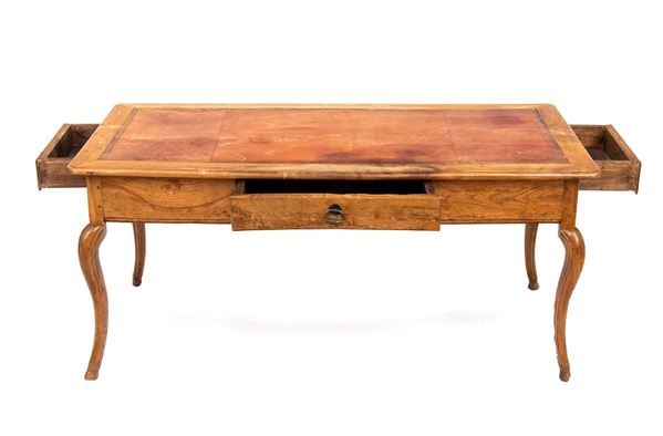 Walnut with central and two side drawers, leather top and cabriole legs.
