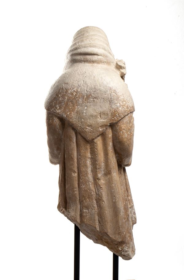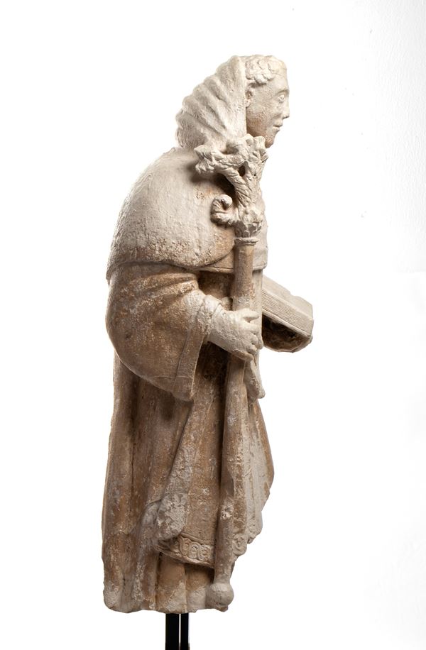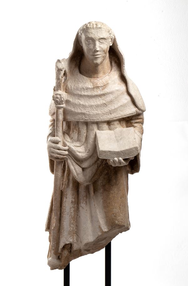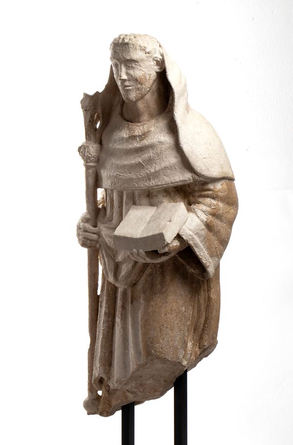 Made of stone, depicting a religious man with Bible and staff. The statue is supported by an iron base.