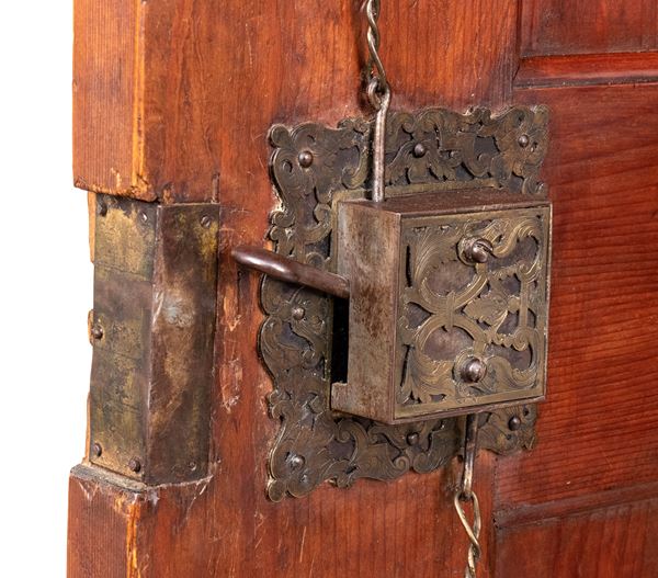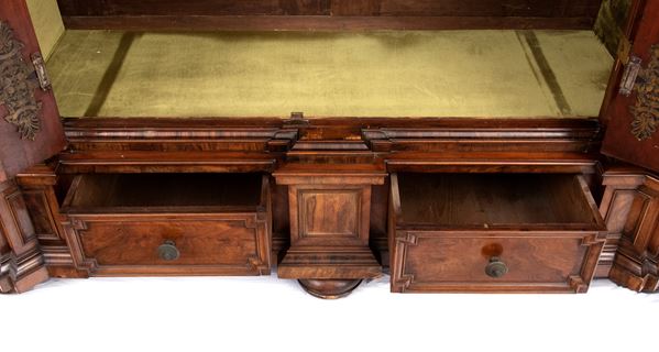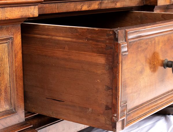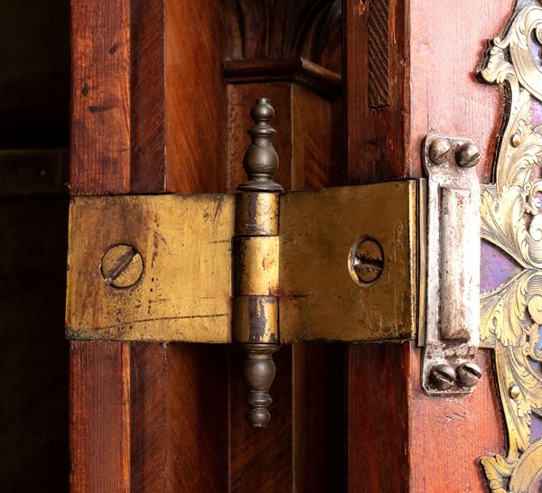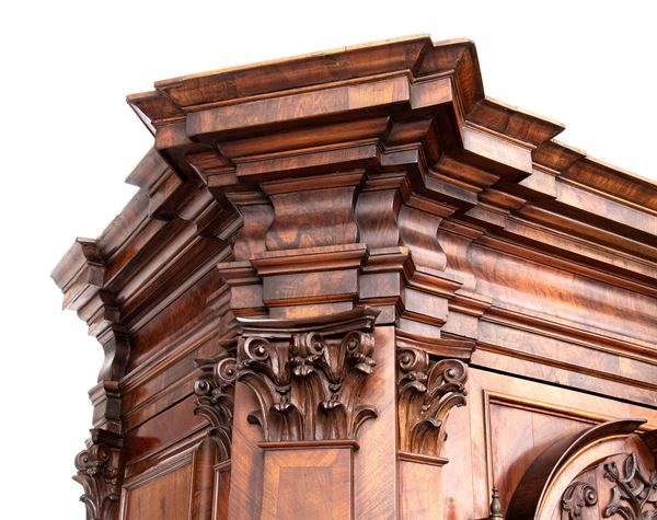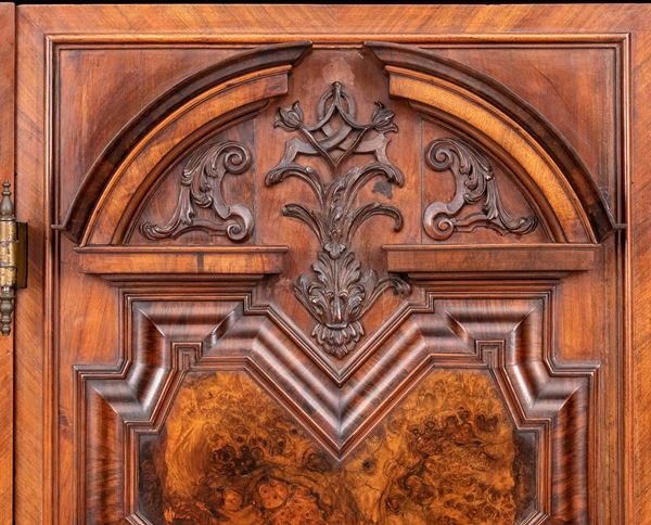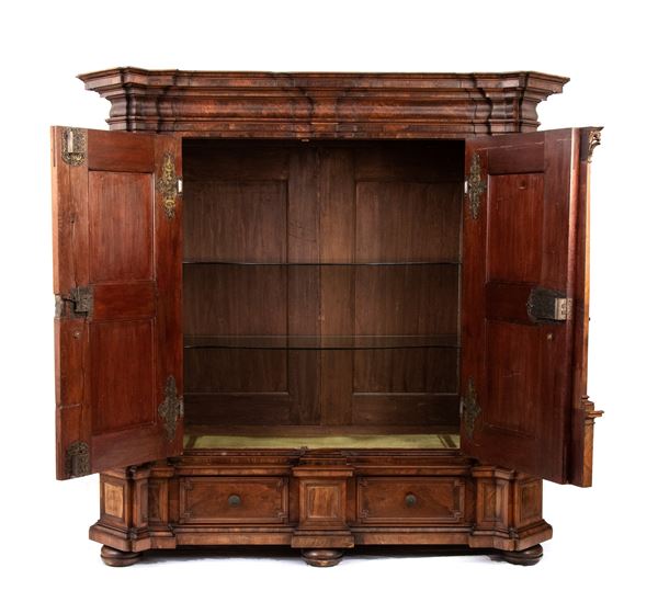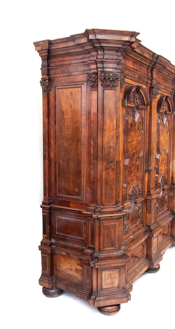 of walnut and burl wood, a masterful example of the craftsman of the Baroque period in northern Europe, finely carved work with locks, hinges and locking posts by a master blacksmith. Furniture of rare beauty and majesty.