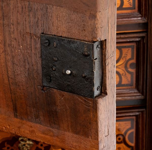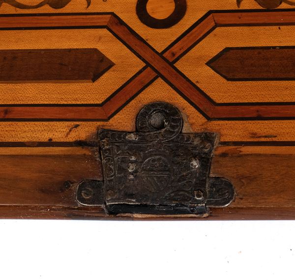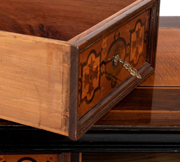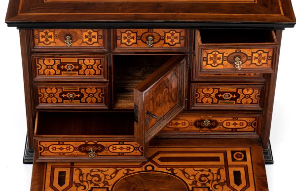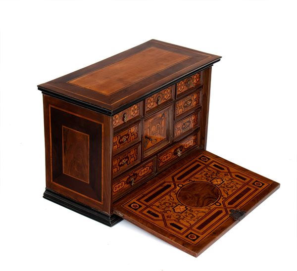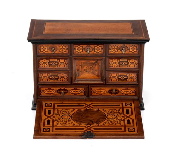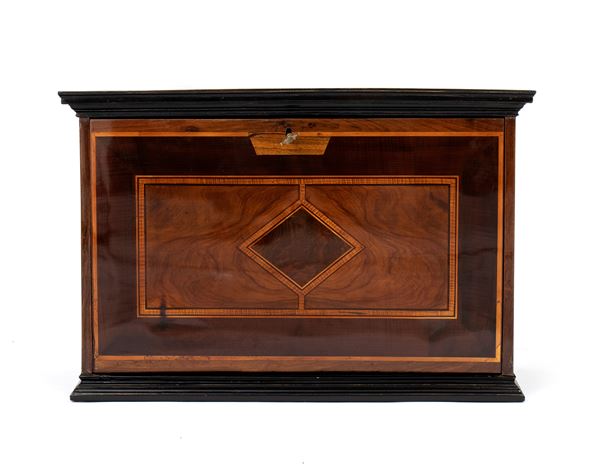Elegant German-made countertop coin cabinet, dating from the 18th century, made of fine woods, walnut, rosewood and finely inlaid.The frame is rectangular with a molded plinth base. The front is embellished with geometric and floral inlays in bois de rose, maple and briarwood.