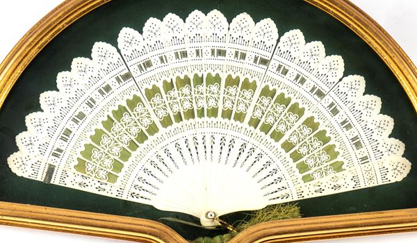 folding hand fan finely pierced, made of bone, mounted on a green fabric background and set in a wooden frame. Composed of thin sticks crafted with great precision, it features an elaborate openwork design in neoclassical style, typical of the refined European production of the period. The sticks, made from smooth and uniformly pale bone, are delicately openworked.