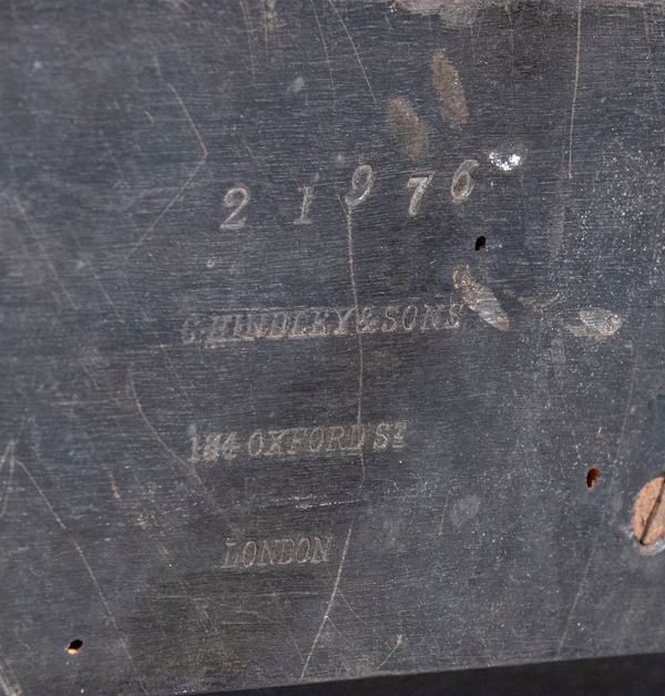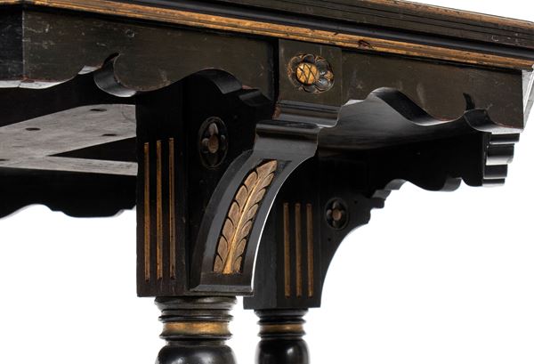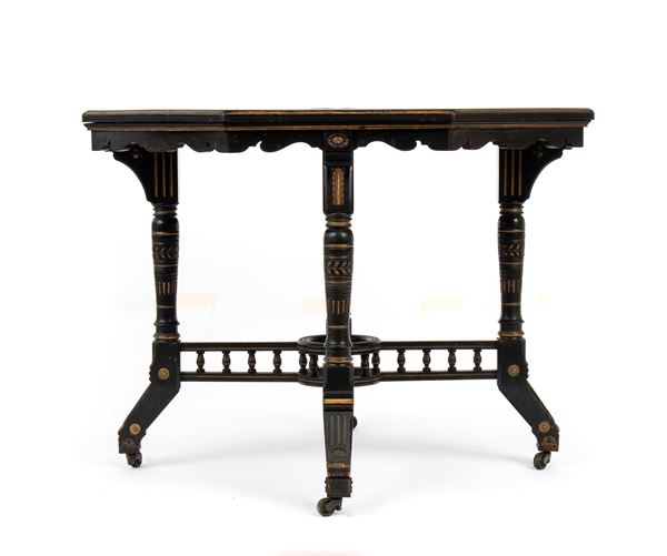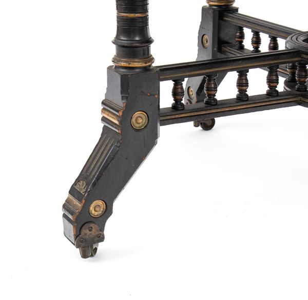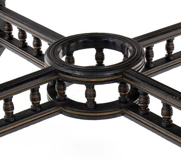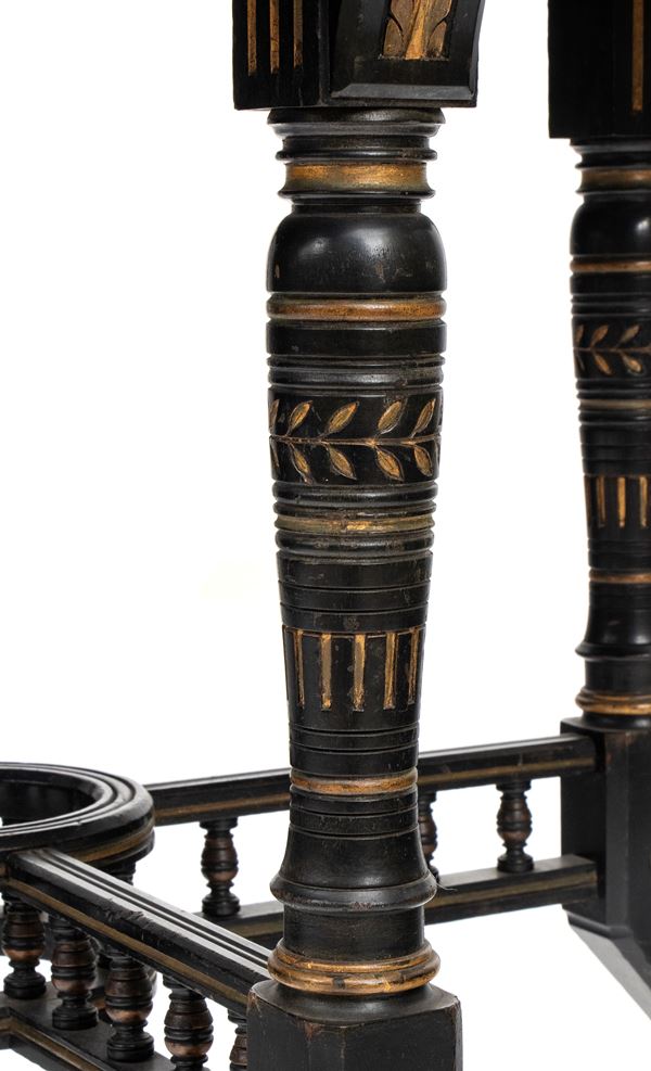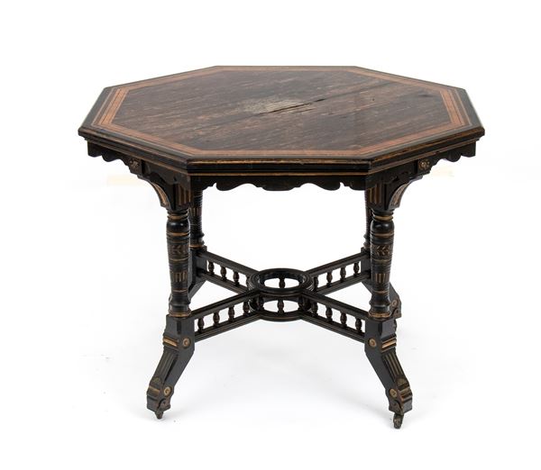 made of calamander wood and satinwood inlays, octagonal in shape, gilded in some carved parts the legs are joined by a railing-shaped crossbar with the end in the shape of a cylinder where a vase of flowers was inserted to embellish the table.Signed under the top Hindley&Sons with serial number.
