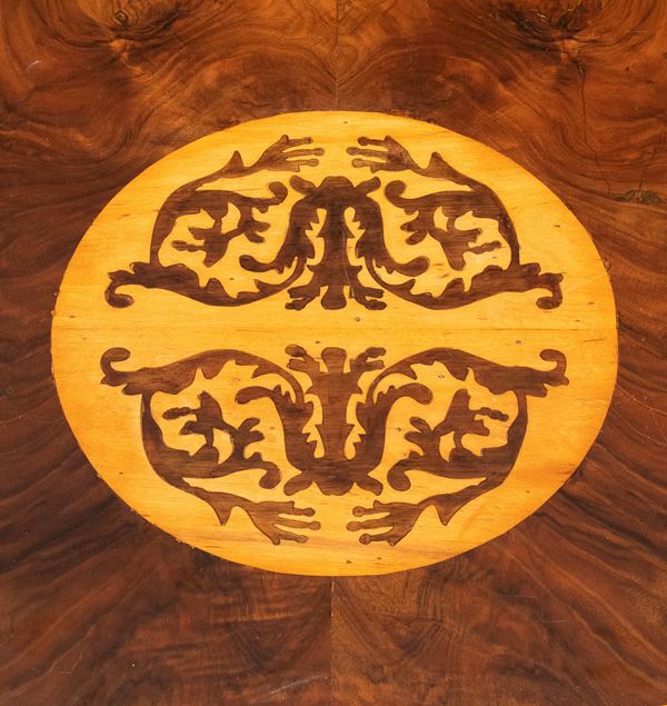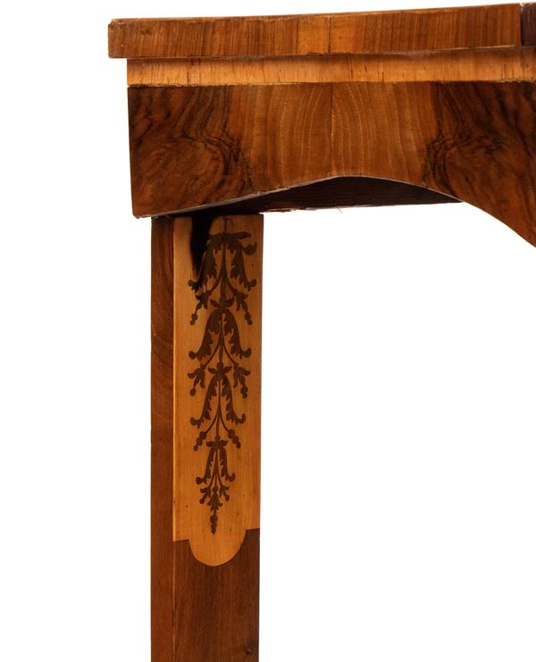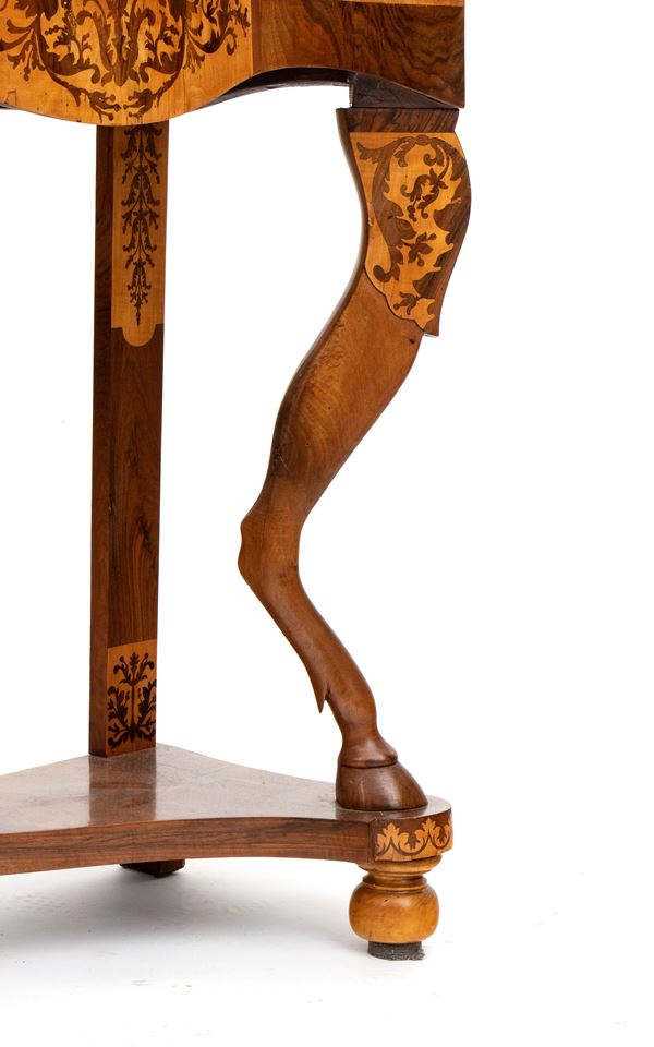 in walnut feather, walnut, and inlaid ,with floral motifs, maple wood, top supported by goat legs.
