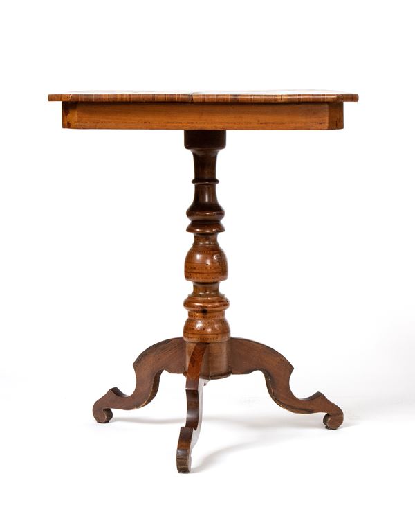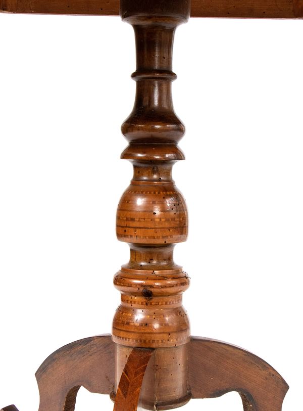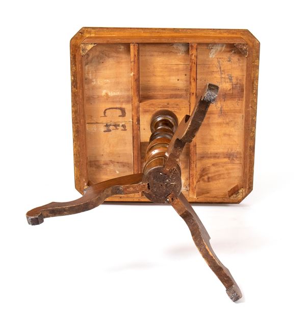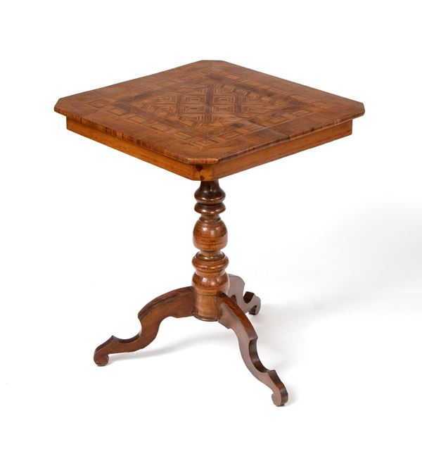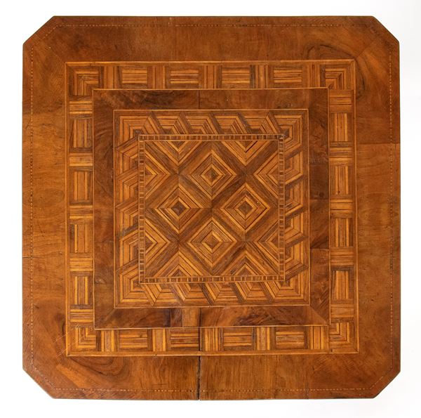 square in walnut inlaid with geometric motifs in fruit wood. Worked central stump foot with ebonised parts.