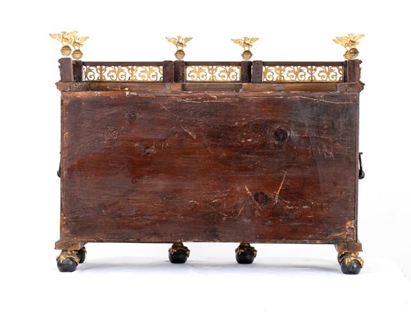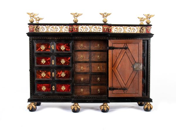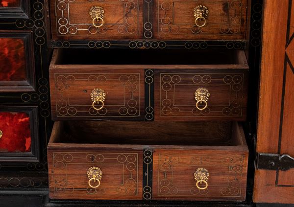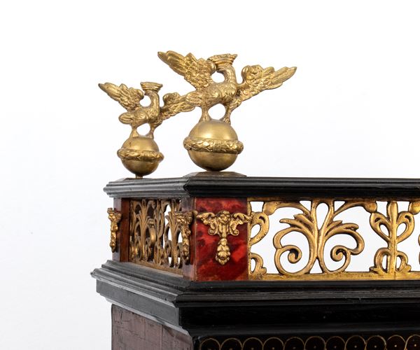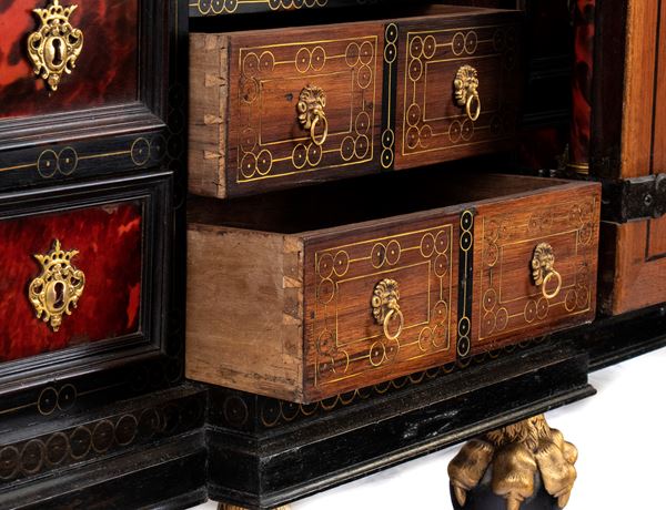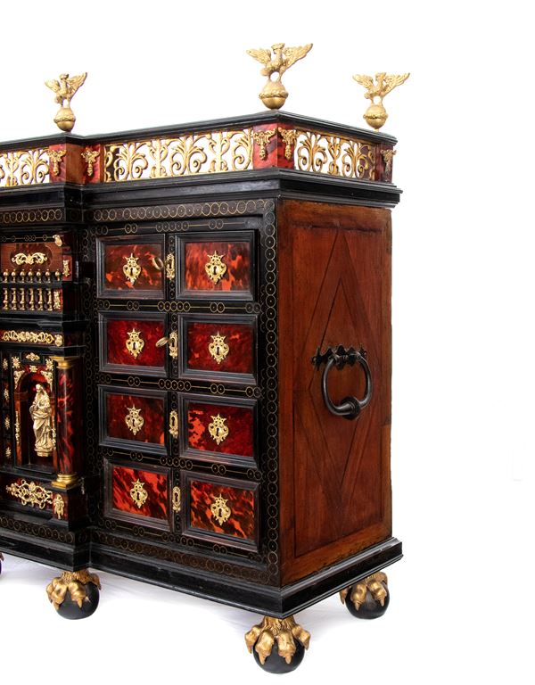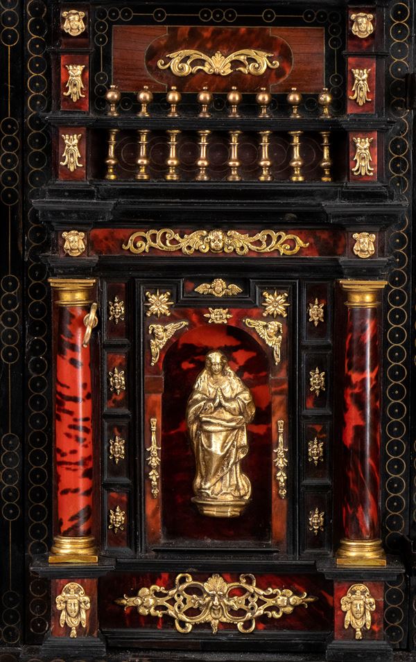 The cabinetโs architecture features a tripartite front richly veneered in turtle shell, with a central door designed in an architectural style, adorned with columns supporting an entablature. This central door is flanked by four drawers on each side, with divided fronts, equipped with original locks and decorated with gilt bronze keyhole escutcheons. At the center, the columns frame a depiction of the Virgin Mary.
