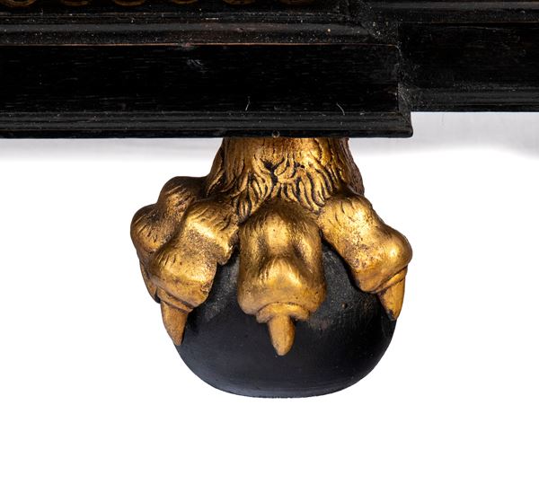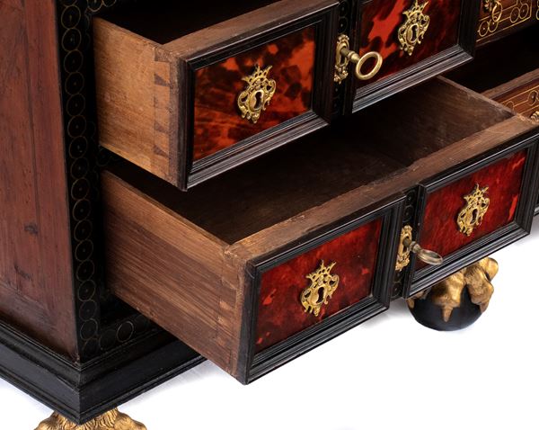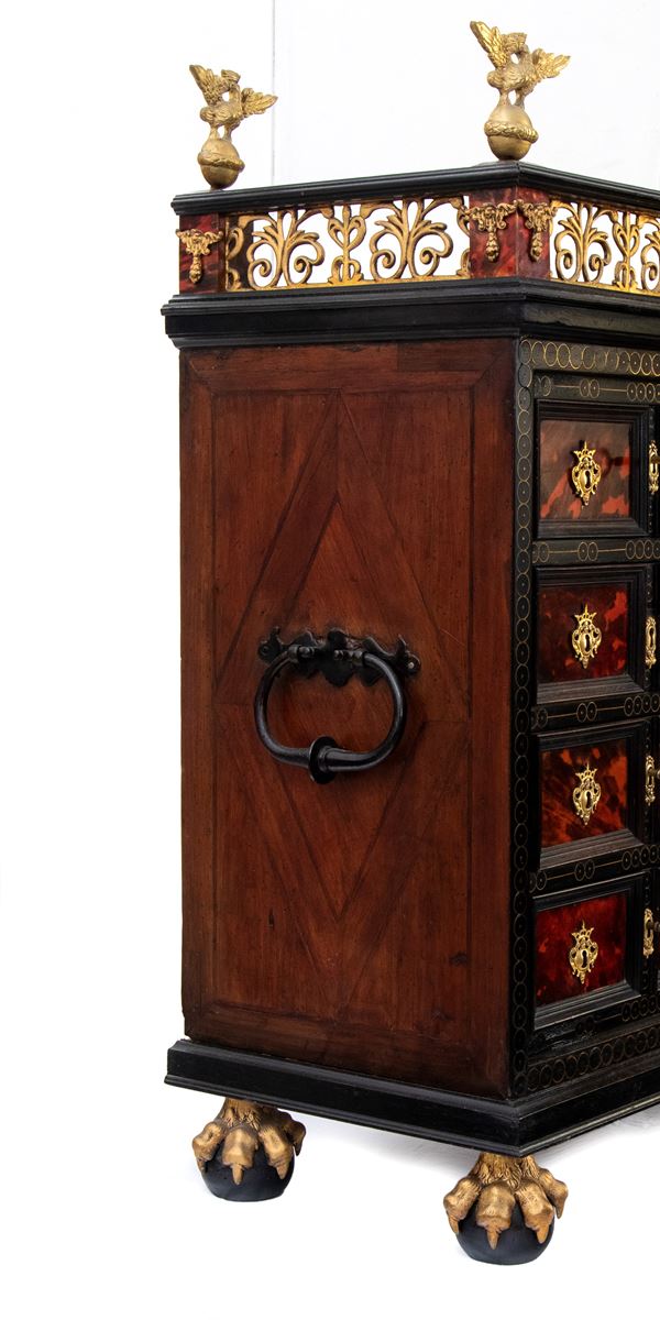 ebonized wooden coin cabinet, with an oak structure, inlaid with tortoiseshell (hawksbill sea turtle, Eretmochelys imbricata, Cheloniidae), and resting on claw and ball feet.