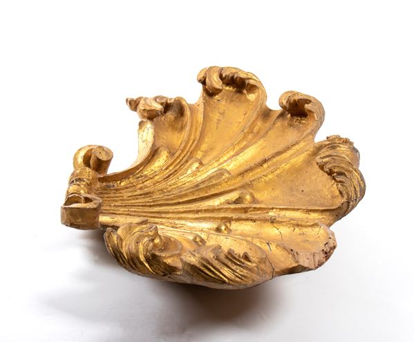 elegant carved and gilded wooden decoration in the shape of a shell, with sinuous lines and refined play of scrolls and curves in the classic Italian Baroque example.
