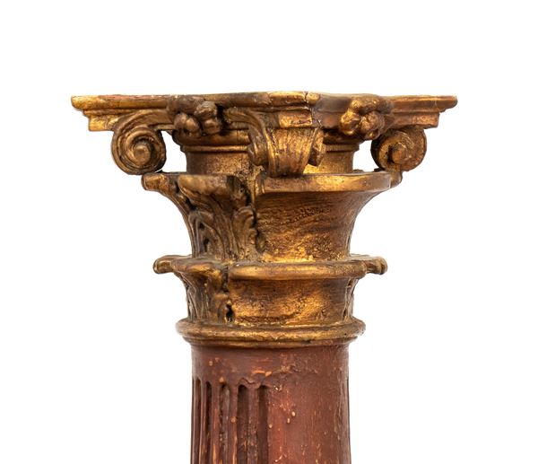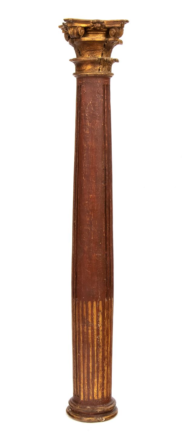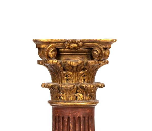 tapered column partly lacquered and partly gilded, circular base and finely carved Corinthian top.