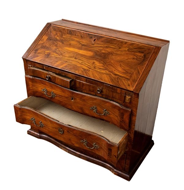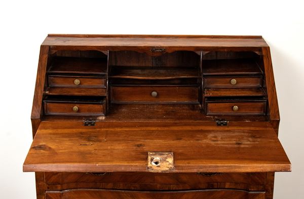 walnut and walnut burl wood, three front drawers with two small drawers under the flip-top. Inside we find five drawers and at the top three open compartments.