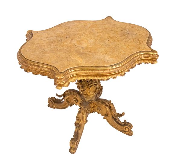 gilded wood, finely carved with floral motifs on the log and flat edge supporting marble top.