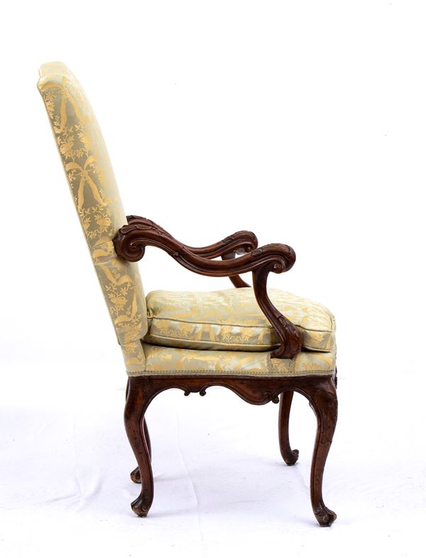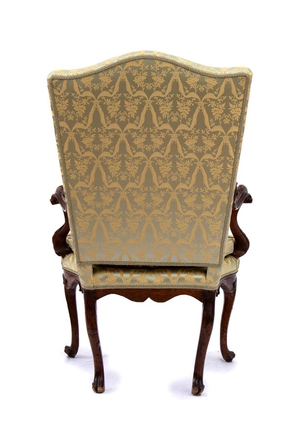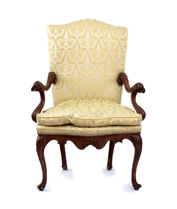 Finely carved with double scroll arms and cabriolet legs joined by crossbeam