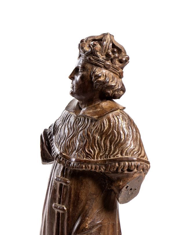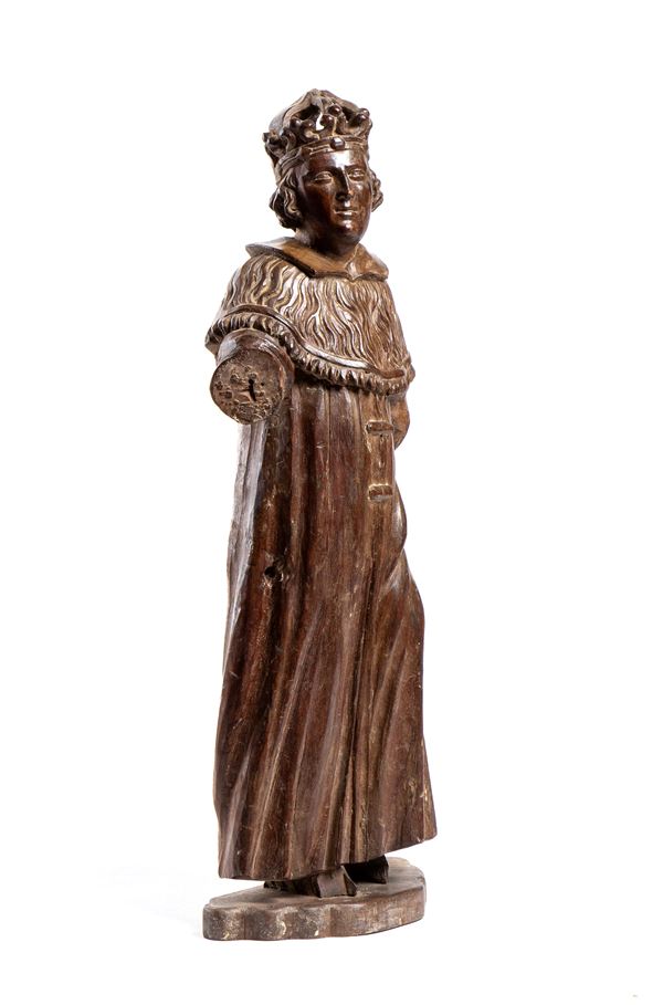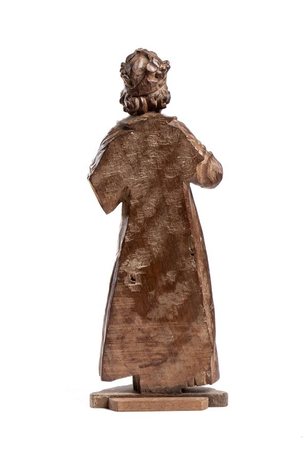 depicting a male figure, probably a ruler or sacred figure. The figure, characterised by a broad cloak and elaborate sauna crown, has a solemn expression and a remarkable carving highlighted by the folds of the robe and hair.
