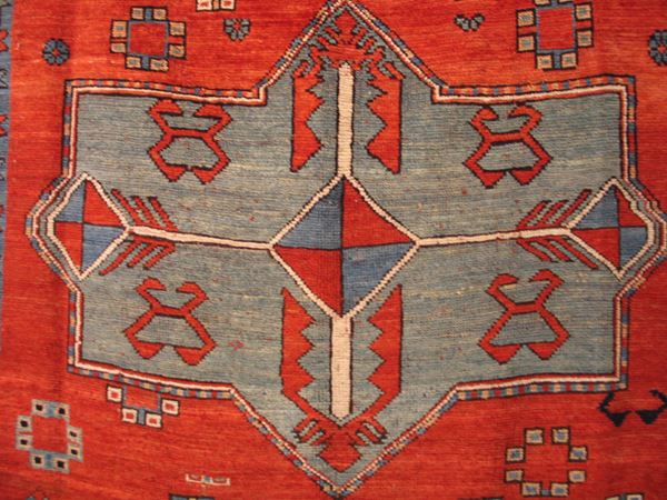 red-colored weft , knotted more densely in the central geometric parts. This type of tapestry , from the Central Caucasus, has both coarser and fine knotting.