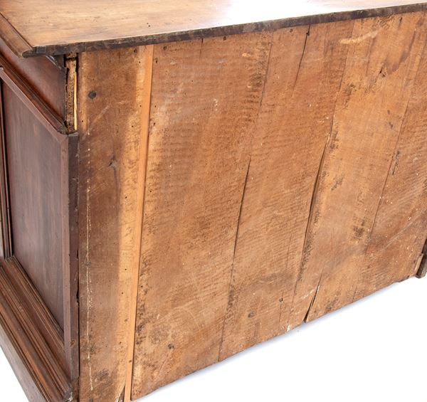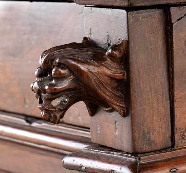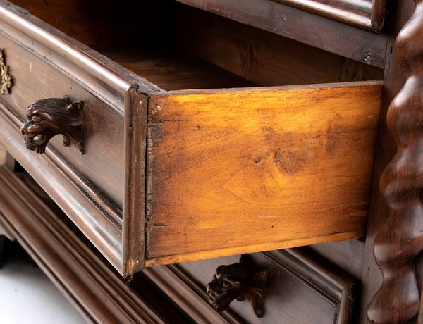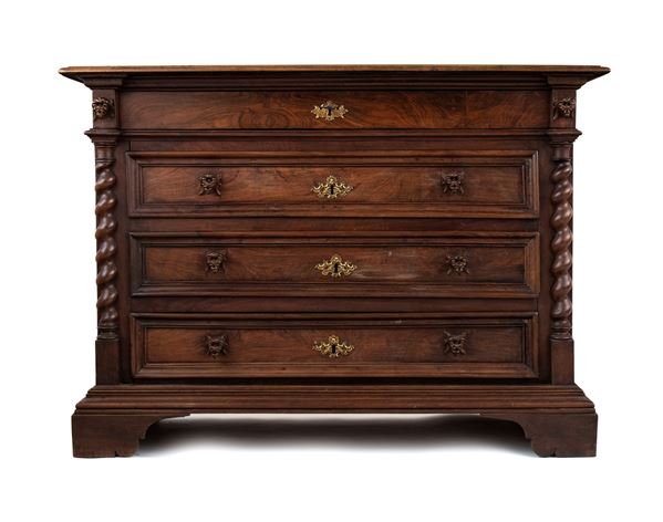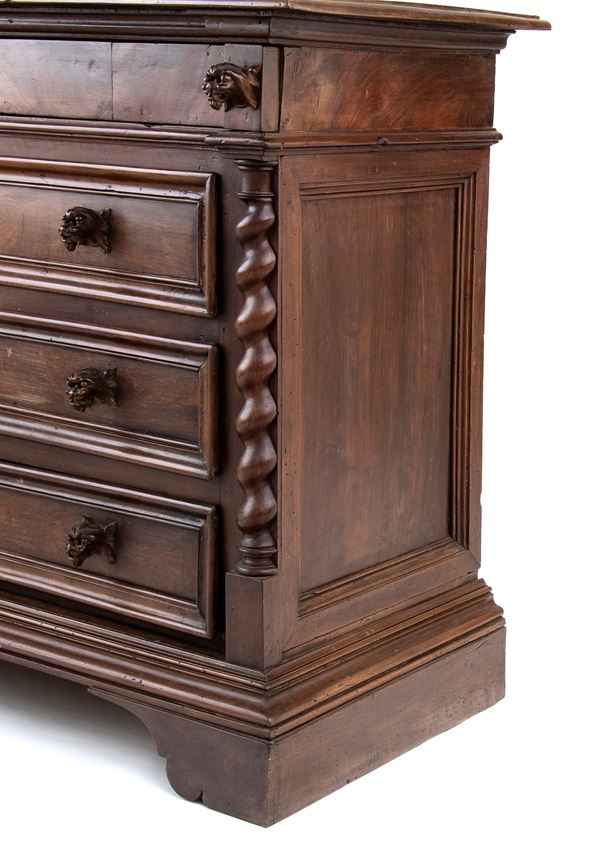 walnut and burl wood with carved twisted pilasters, four drawers, three of which have carved animal head knobs. Original heart-shaped locks. Ligurian area mid-eighteenth-century period.