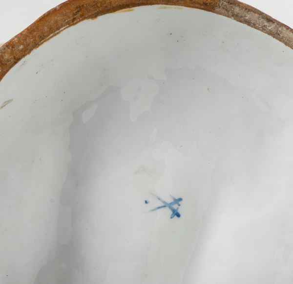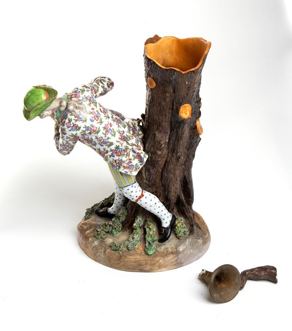 Polychrome porcelain figure depicting a horn player beside a tree trunk, wearing brightly decorated rococo-style clothing. Hanging hunting animals and accessories at the base. Very high quality workmanship, probably modeled after a design by Johann Joachim KΓ€ndler. Crossed sword mark in blue under base.