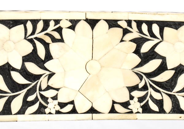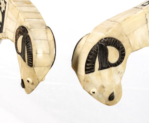 ebony wood (Diospyros spp.) frame completely covered in bone to create geometric and floral shapes; wraparound top with goats' heads embellishing the back; saber legs.