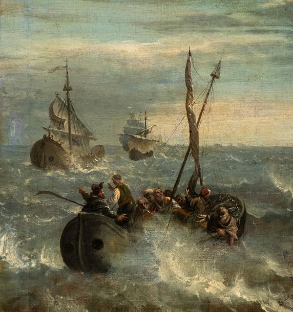 depicting sailboats in a stormy sea, within gilt wood frame.