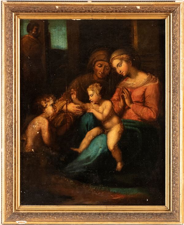 The canvas is an ancient faithful copy of Raphael's painting now in the Capodimonte Museum known as the Madonna del Divino Amore.