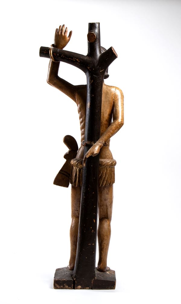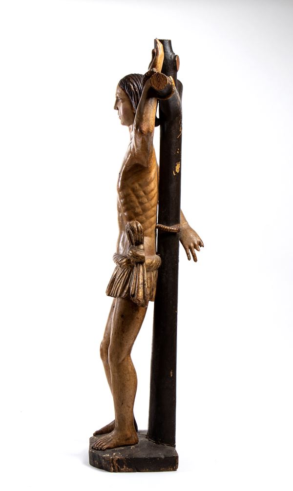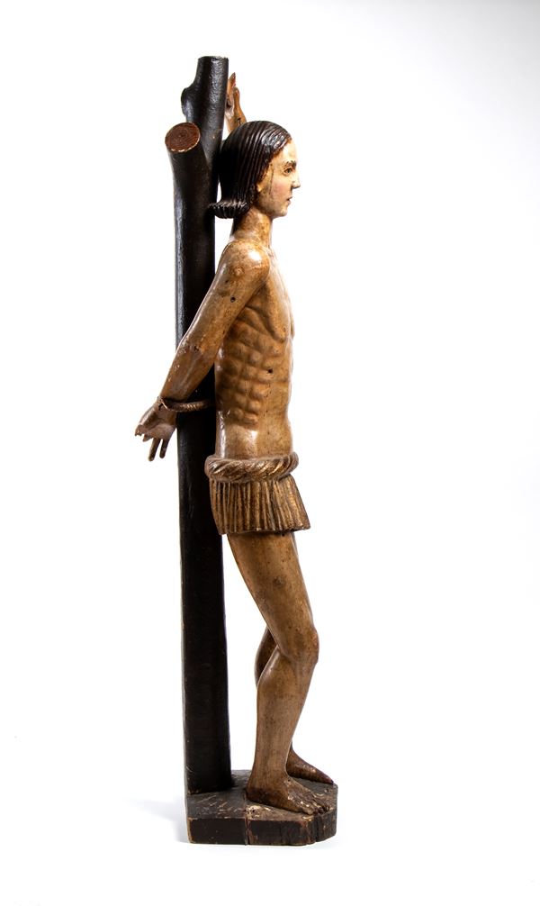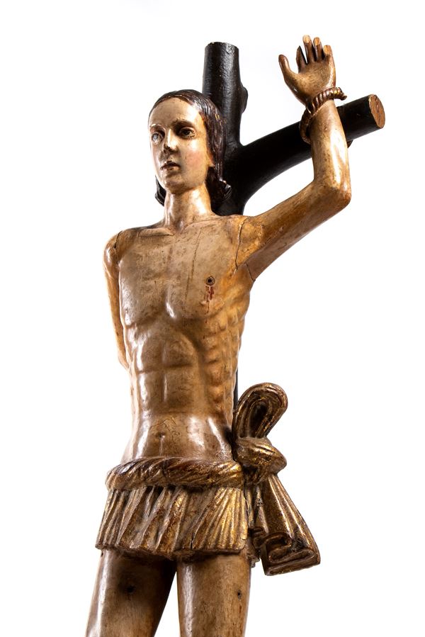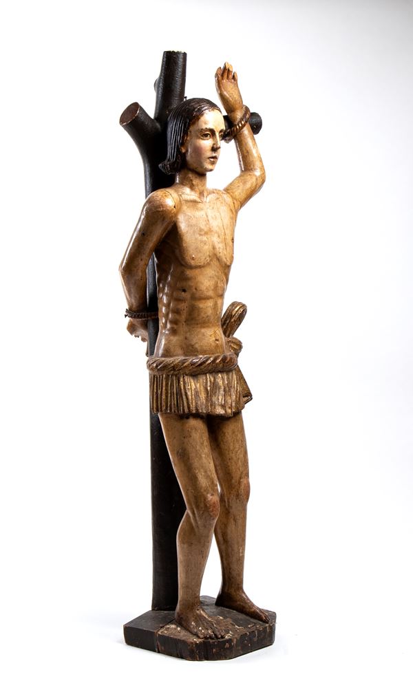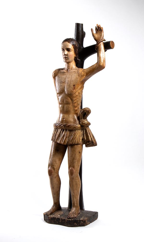 Polychrome wood carving with gilding. The saint is depicted frontally, tied to a stylized cross-shaped trunk, according to traditional iconography. The body, idealized but marked by slight wounds, shows a simplified but effective anatomical rendering. Stylistic traits, such as the facial expression and the rigidity of the limbs, suggest a folk production, perhaps intended for a rural chapel. Traces of repainting and wear consistent with the period.