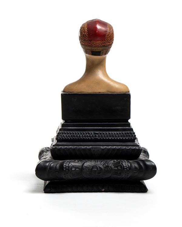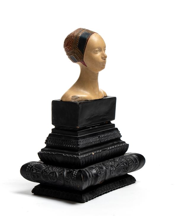 The head, delicately modeled with stylized features and hair gathered under an ornate cap, is mounted on a classical-style architectural base with rich ornamental motifs.