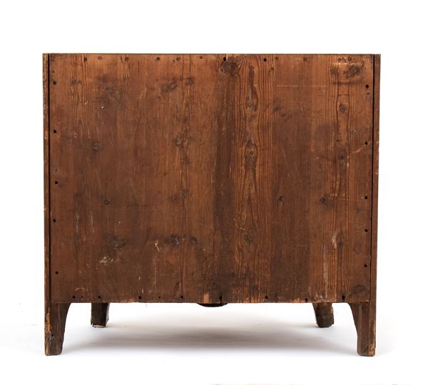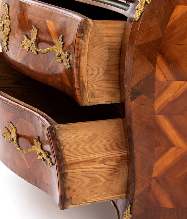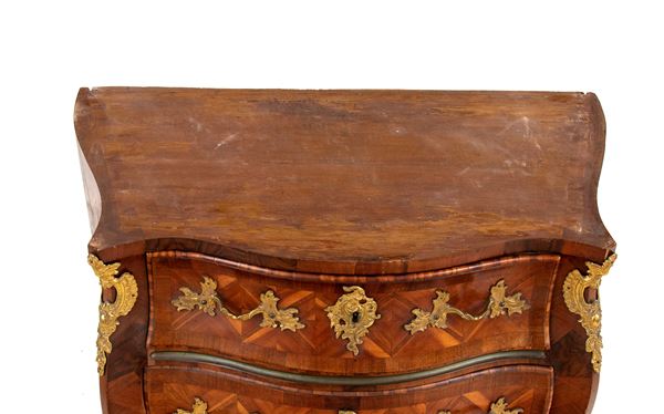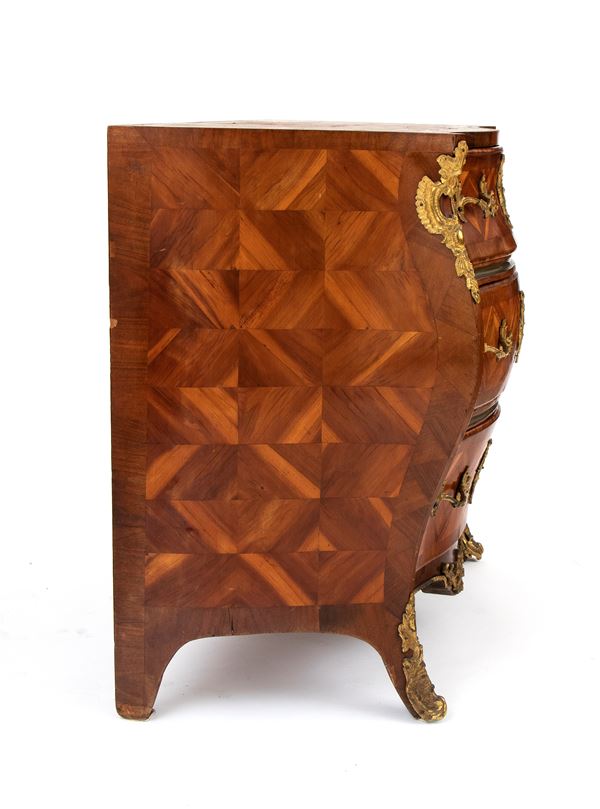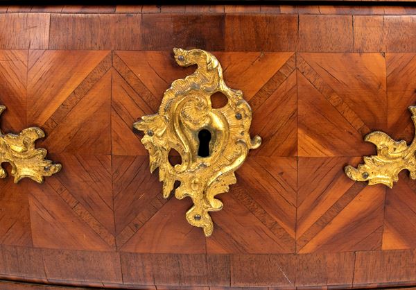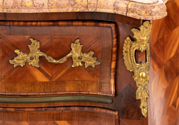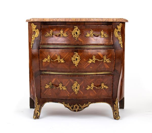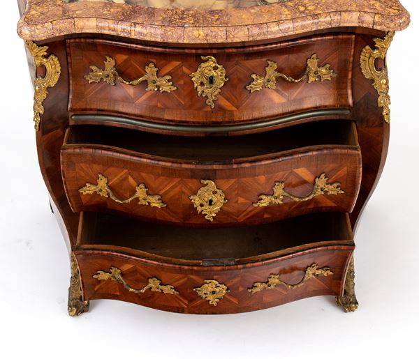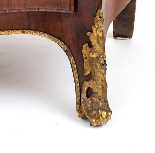 second quarter of the 18th century, rosewood, with marble top and gilt bronze appliqués, moved on sides, front, and with uprights ending in cabriole leg. Original locks and hardware.