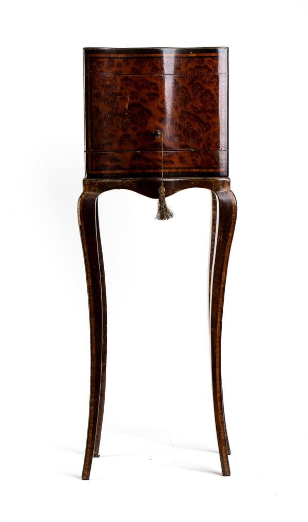 elm burl veneered and purple ebony inlaid (Dalbergia cearensis); the front panel opens to reveal two silver containers and eight silver small cups.