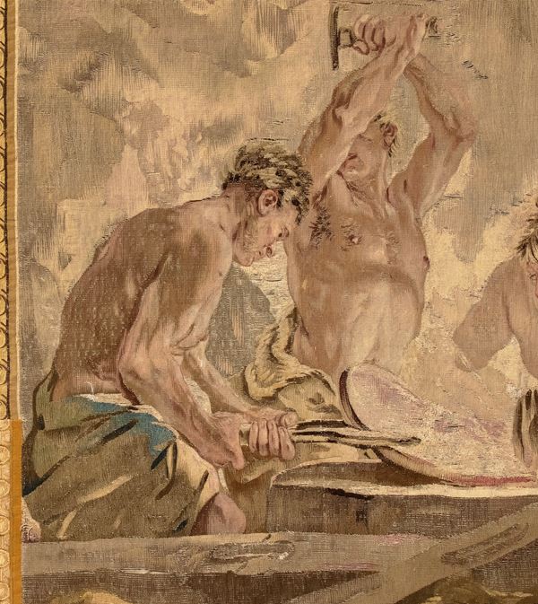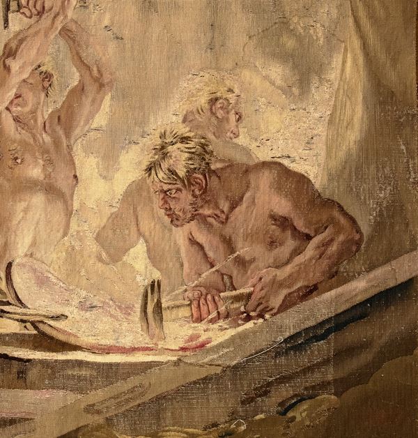 depicting "the forge of Mercury", the Roman god of crafts, trade and messengers, overseeing the work of skilled blacksmiths intent on forging metals. The visually striking scene depicts four men engaged in the art of forging, with dynamic details expressing strength and craftsmanship. The energy of labor and passion for the art of forging are palpable, while the intervention of the god Mercury, a symbol of cunning and ingenuity, permeates the entire work.