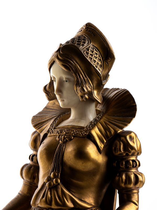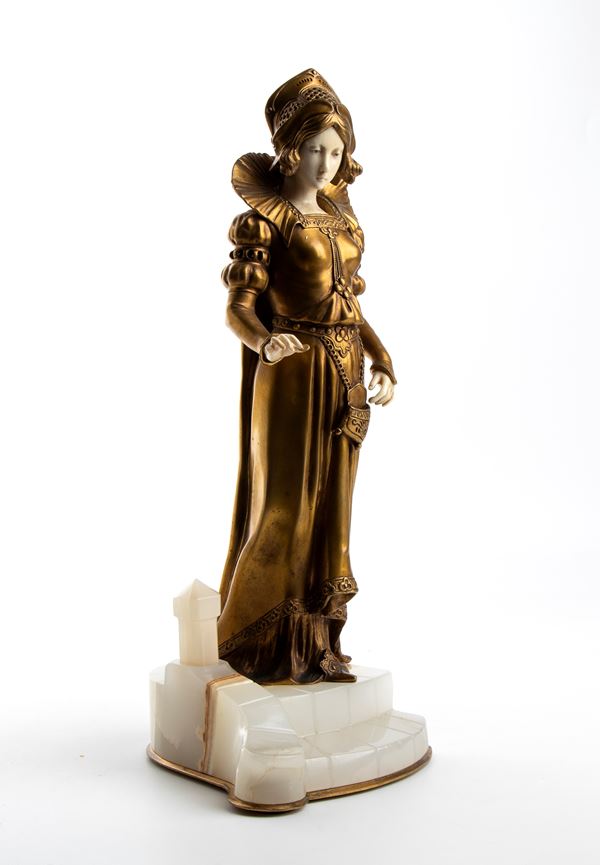 Finely dressed standing Elizabethan maiden, bronze and ivory, circa 1900
