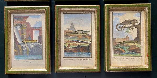 Lotto di sei xilografie colorate a mano, 135 x 900 mm cad. Con belle cornici argentate a foglia (18 x 12 x 1 cm)