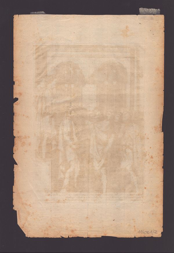 Molto fresca e ben inchiostrata impressione con tonalità sul fondo. Stampata su carta vergata priva di filigrana. Foglio con segni di fioritura e strappi sui margini. Traccia di piega all'angolo inferiore. Residui di scotch in alto.