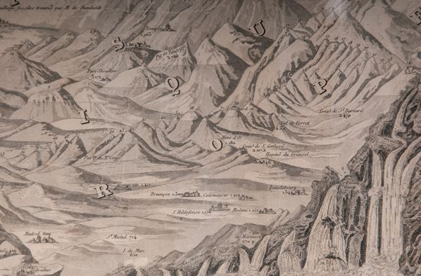 Carta uniformemente brunita, con alcuni strappi lungo i bordi. Con cornice e vetro 72 x 84 x 2 cm.