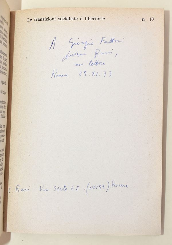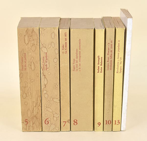 Luciano Russi, Pisacane e la rivoluzione fallita del 1848-49 (edizione del 1972 con dedica autografa dell'autore). Stefano Arcangeli, Errico Malatesta e il comunismo anarchico italiano (1972). Eugen Varga, La crisi del capitalismo e le sue conseguenze economiche (1971). C. Talès, La Comune del 1871. Alba e tramonto (1971). Daniel Guérin, Né dio né padrone (in 2 volumi, 1971). Gianfranco Dellacasa, Rivoluzione e fronte popolare in Spagna '36/'39. 1973. Lev Trotskij, Il programma di transizione (Edizioni Bandiera Rossa, 1972).