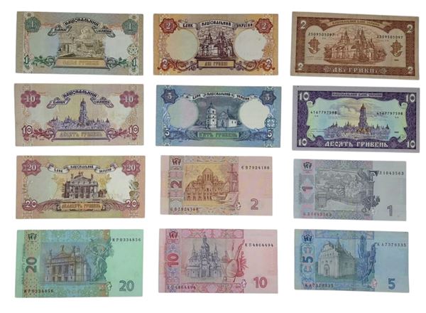 UCRAINA. Lotto di 12 banconote. Date, tagli e conservazioni varie.