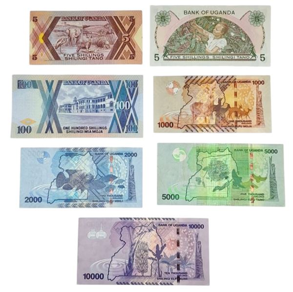 UGANDA. Lotto di 7 banconote. Date, tagli e conservazioni varie.
