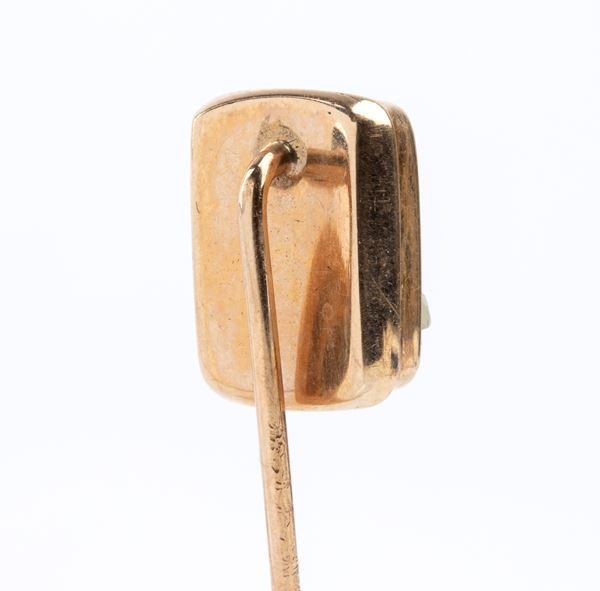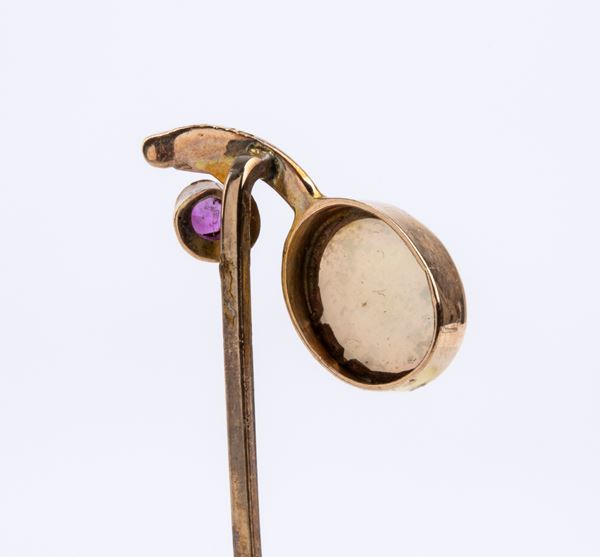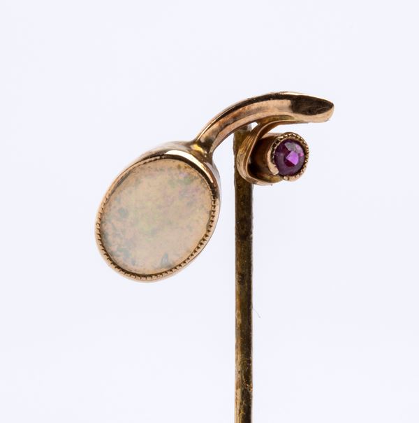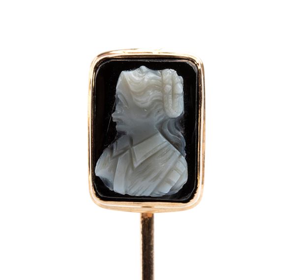a pin with cameo depicting a profile of a female figure and a pin with a noble opal cabochon.
