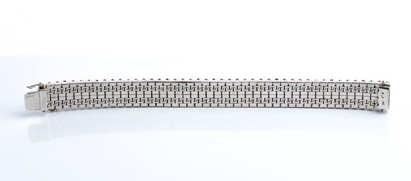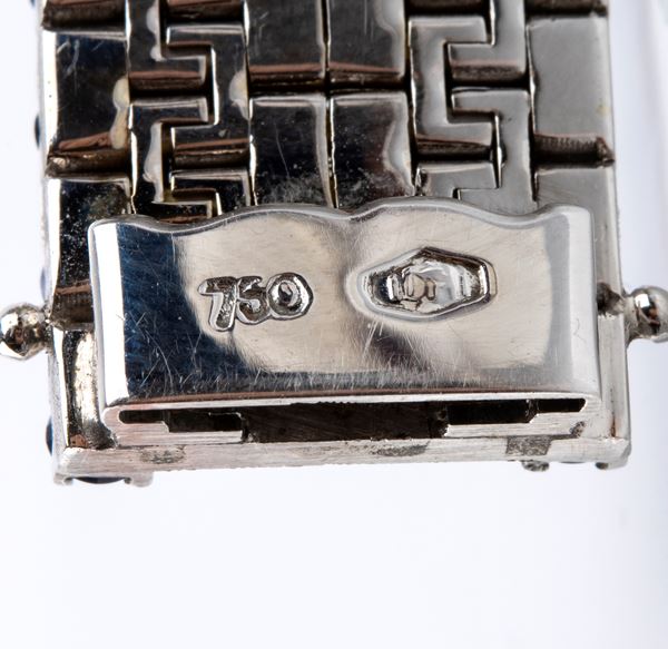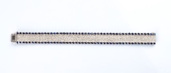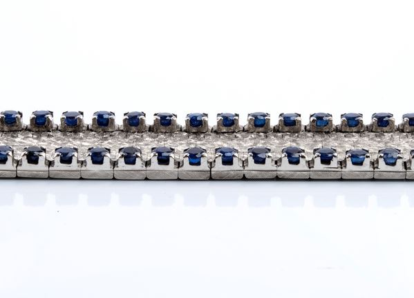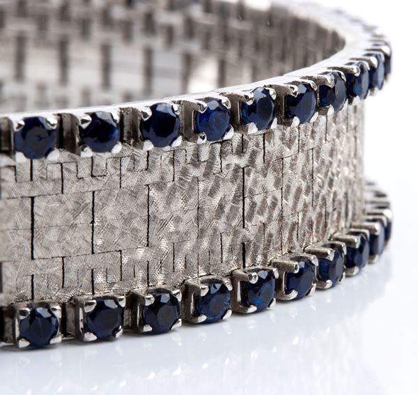 18k white gold flexible band, set with sapphires estimated to weigh a total of approximately 3.50 ct.