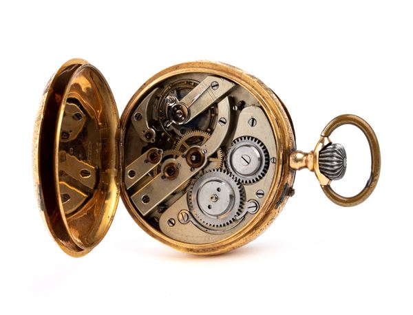 18k gold hunter case, white enamel dial with Arabic numerals and small seconds at 6 o'clock, signed Jupiter. Movement with 15-jewel anchor escapement and remontoir winding.