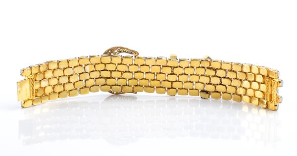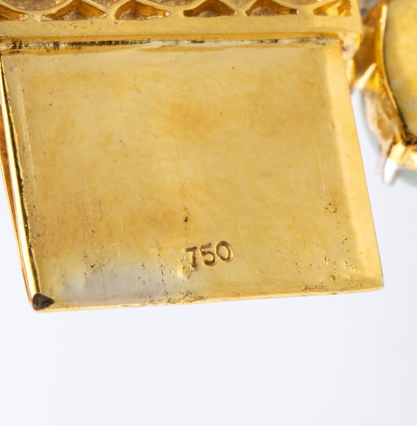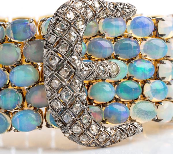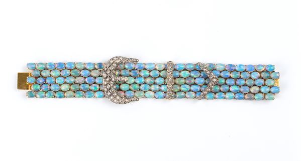 Gilded silver ribbon set with 125 white harlequin opals, silver buckle motif set with pavé rose-cut diamonds weighing approximately 3.00 ct, 18k yellow gold hook clasp.