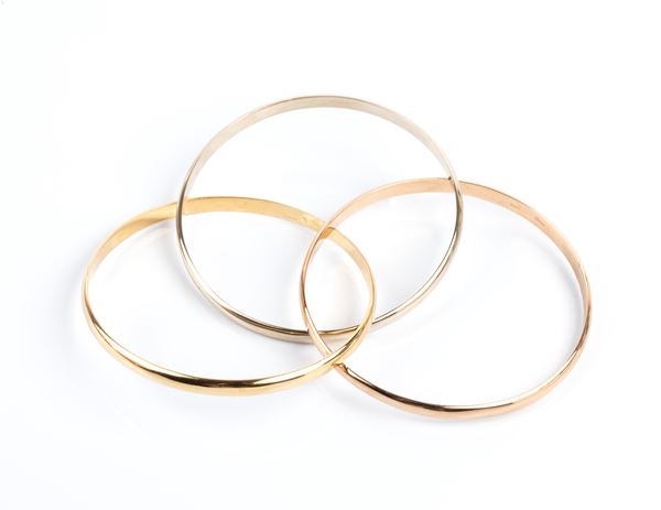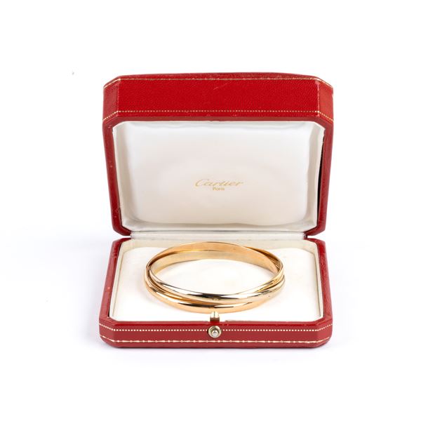 18k three-color gold, with emblematic three-ring entwined motif. Signed CARTIER.