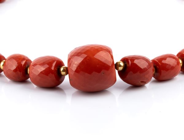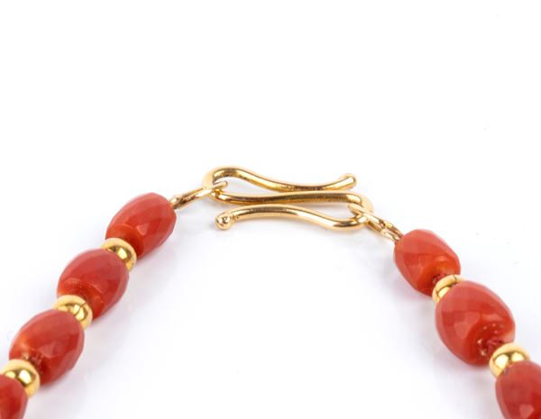 one strand of Cerasuolo coral (Corallium Elatius) faceted beads, yellow gold spacers and hook clasp.