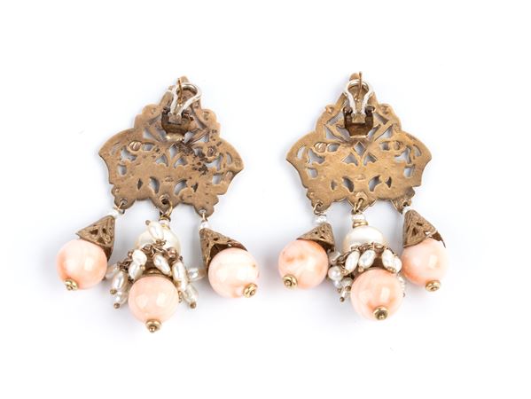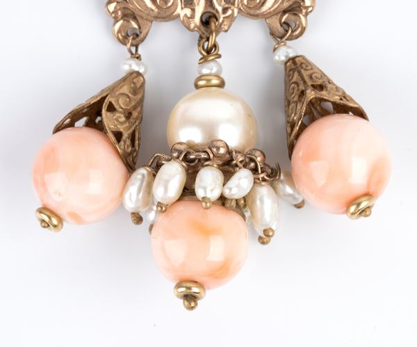 8k yellow gold, openwork ribbon motif, with cultured pearls and Cerasuolo coral beads fringe (Corallium Elatius).