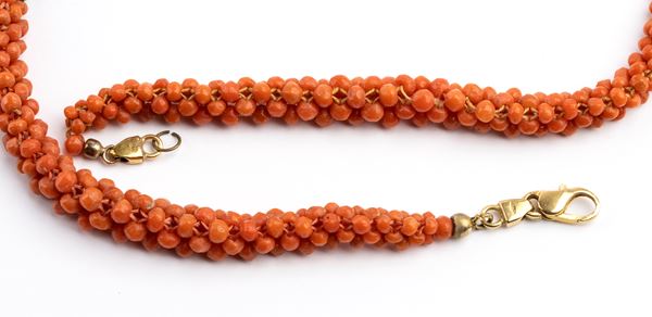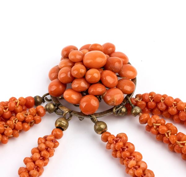 small Mediterranean coral (Corallum Rubrum) beads, woven fabric, floral motifs, copper frame.